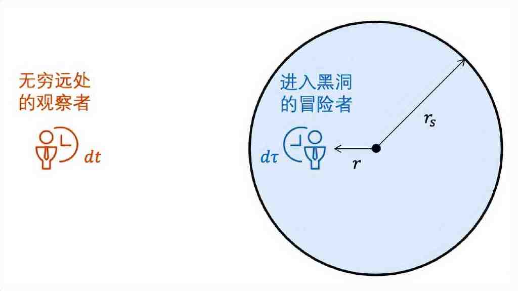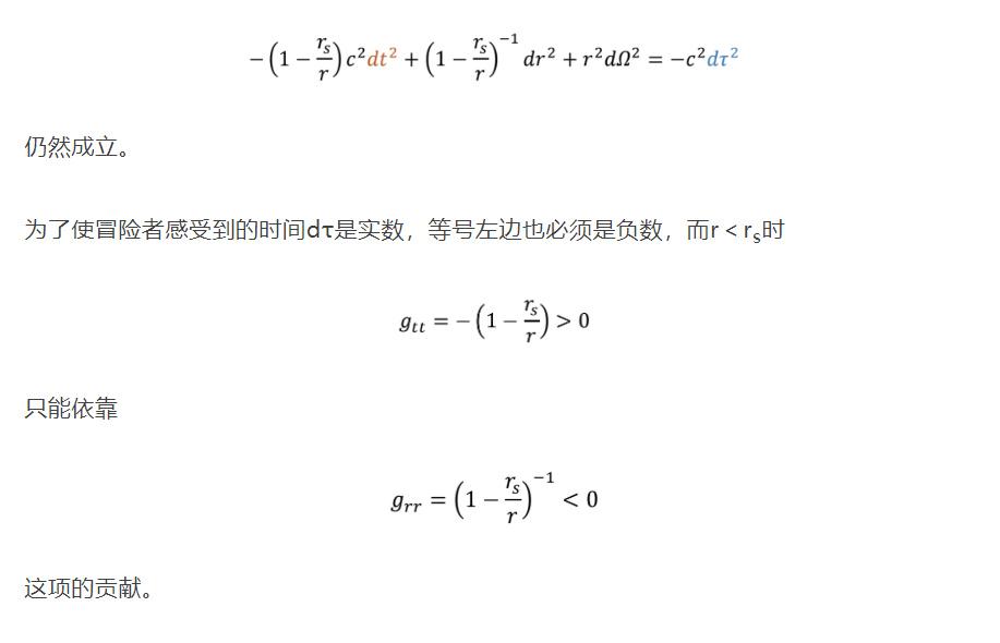 当r<rs时,冒险者就进入了单向区,我们来看看这里的时间与空间是如何互换的。