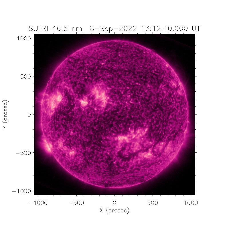近日,中科院空间新技术试验卫星上搭载、由同济大学负责主体研制的46.5nm极紫外太阳成像仪(Solar Upper Transition Region Imager,简称“SUTRI”)顺利开机,成功获得首批太阳过渡区(太阳色球与日冕之间的层次)动态成像观测数据,并捕获到近期太阳上的一些活动现象。此次观测也是继1973年美国天空实验室(Skylab)上的无缝光谱仪拍摄全日面Ne VII 46.5nm图像后,人类近半个世纪来首次在46.5nm波段拍摄到的太阳的完整图像。