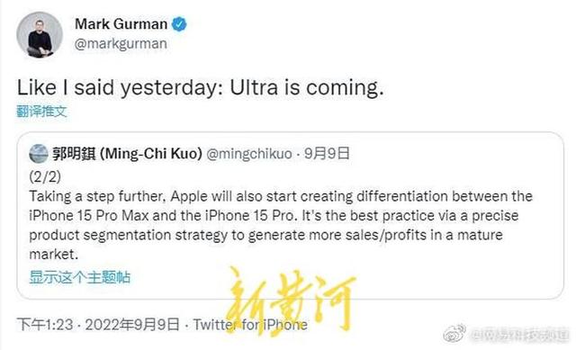 分析师郭明錤给出的爆料,明年iPhone 15系列的命名将会发生较大变化。彭博记者Mark Gurman直接转发了郭明錤推文,暗示Pro Max在iPhone 15系列身上会消失,取而代之的是Ultra机型,这似乎更加贴近一部分安卓旗舰的命名。