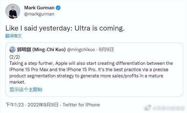 据快科技消息,对于苹果来说,明年的iPhone 15系列才是真正意义上的大改款。苹果几乎两年一大换代,命名上或许也要做一些调整。分析师郭明錤给出的爆料,明年iPhone 15系列的命名将会发生较大变化。彭博记者Mark Gurman直接转发了郭明錤推文,暗示Pro Max在iPhone 15系列身上会消失,取而代之的是Ultra机型,这似乎更加贴近一部分安卓旗舰的命名。