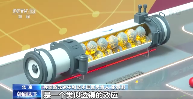 等离激元碳中和技术展区负责人 张英娜:最核心的技术就是一个等离激元技术,它是一个物理现象,类似透镜的效应,可以聚焦光,聚焦热辐射,当太阳光或者很低能量的热源照到催化剂上时,它就可以产生巨大的能量,发生一些化学反应。