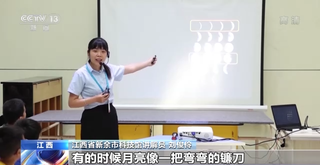 江西省新余市科技馆讲解员 刘俊伶:有的时候,月亮像一把弯弯的镰刀,那有的时候月亮又像一个什么呀?大大的圆盘。