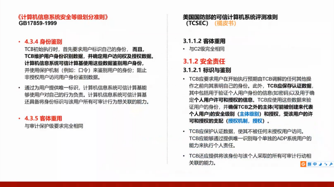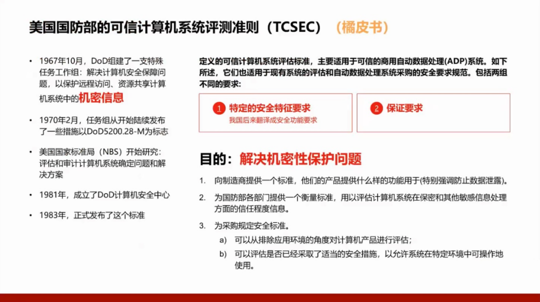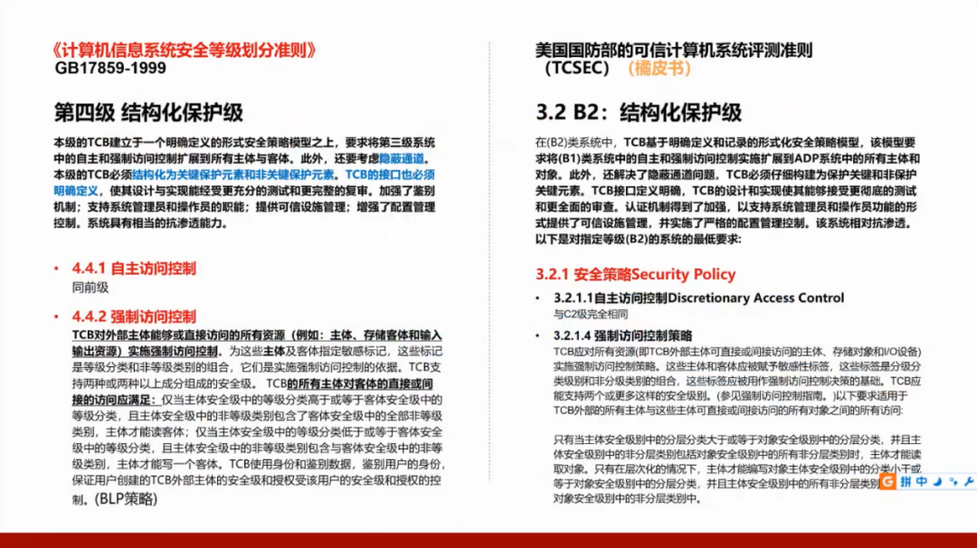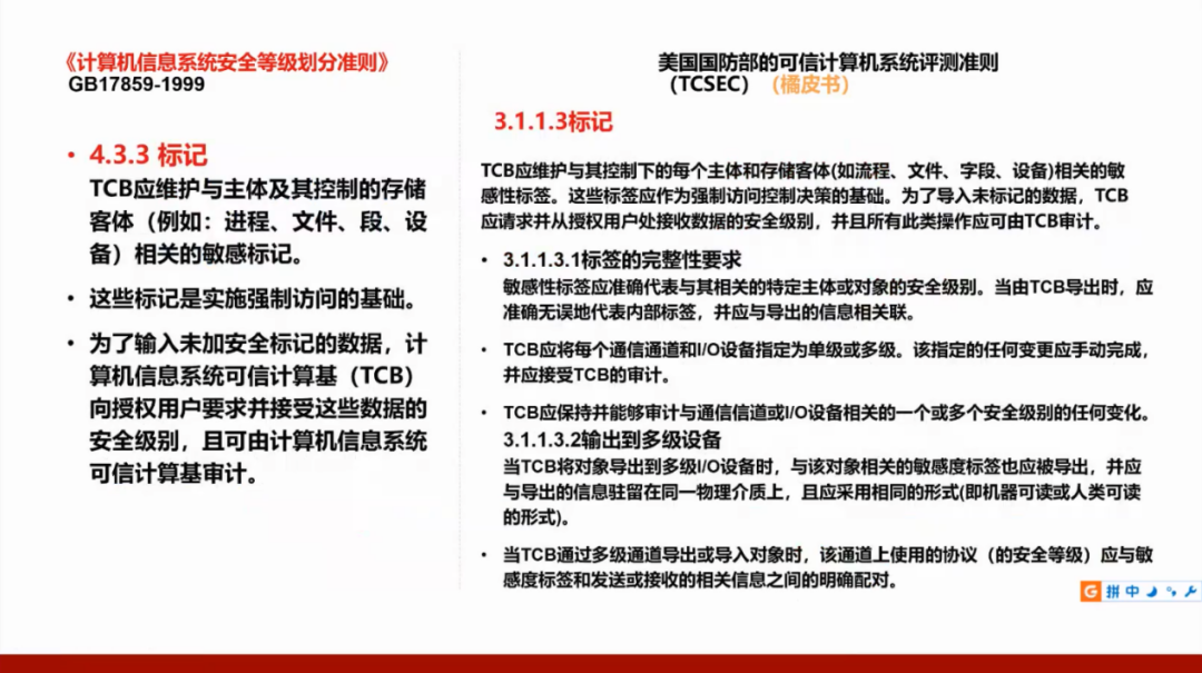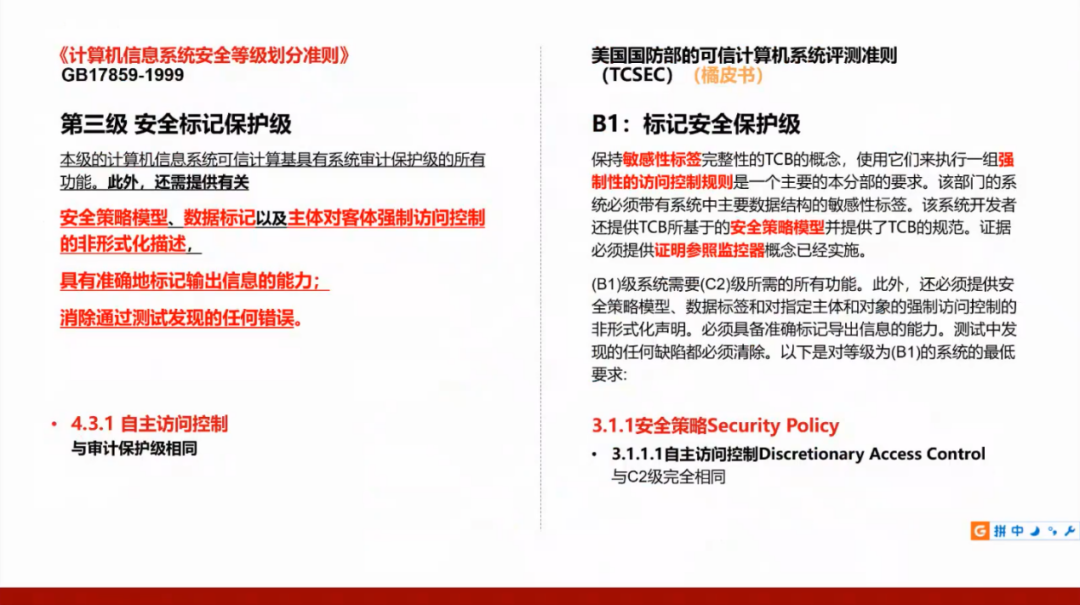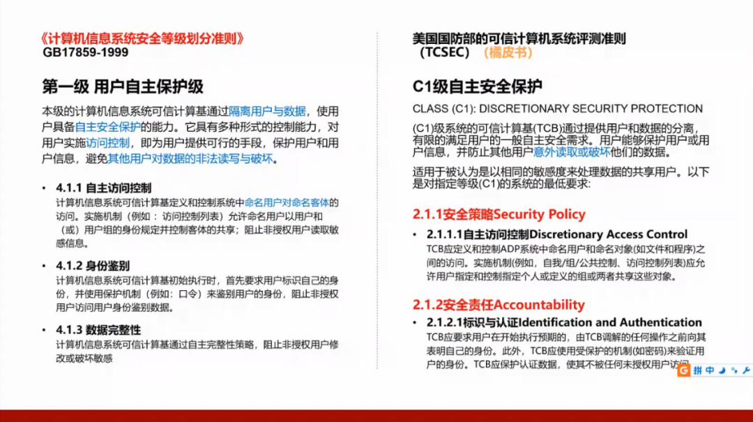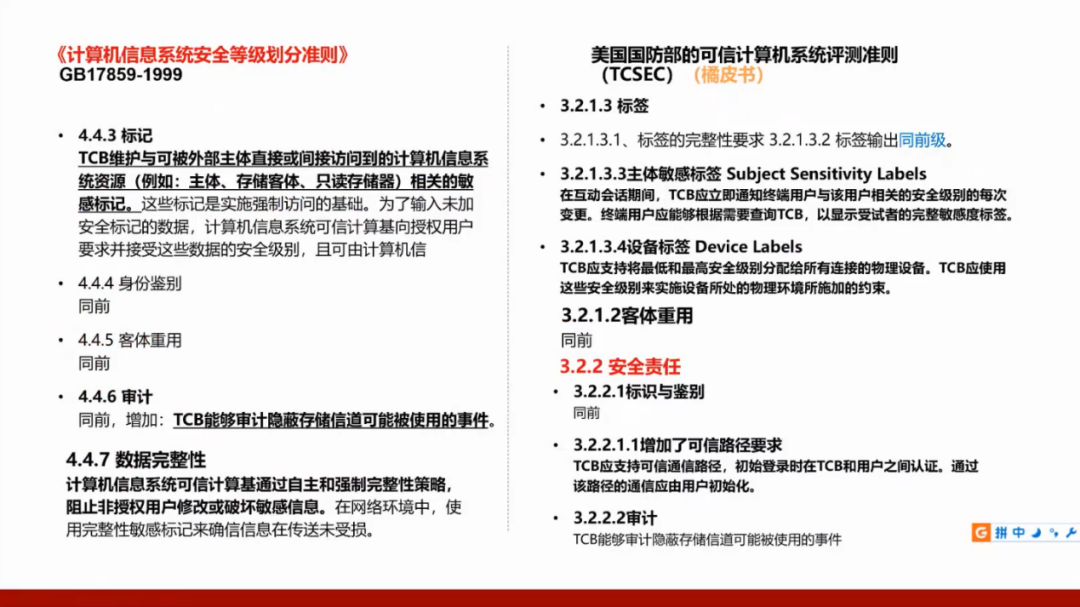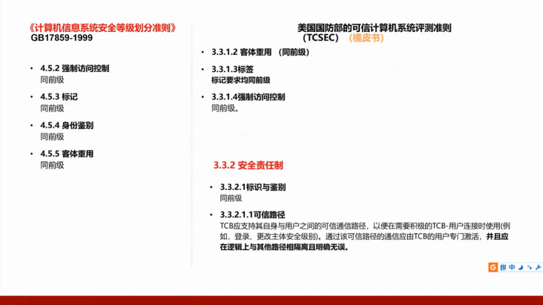 我们国家的GB17859标准是从美国国防部的可信计算机系统评测准则(TCSEC)演变而来,所以需要了解美国的标准,并且将这两个标准进行对照。