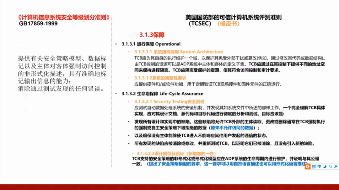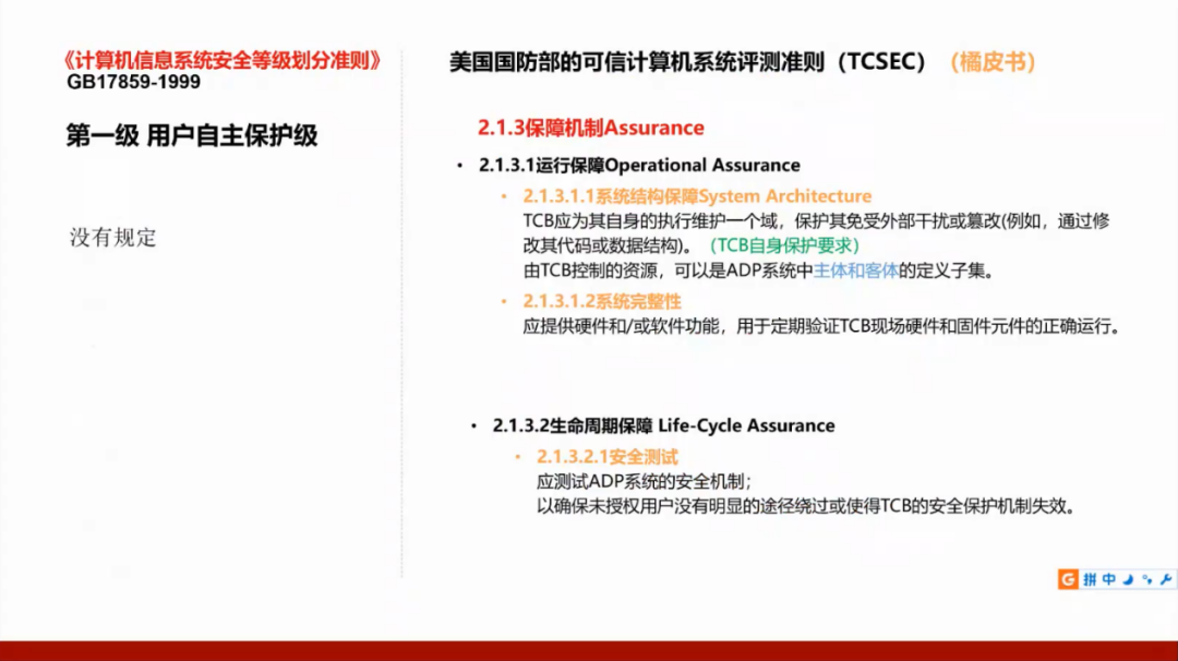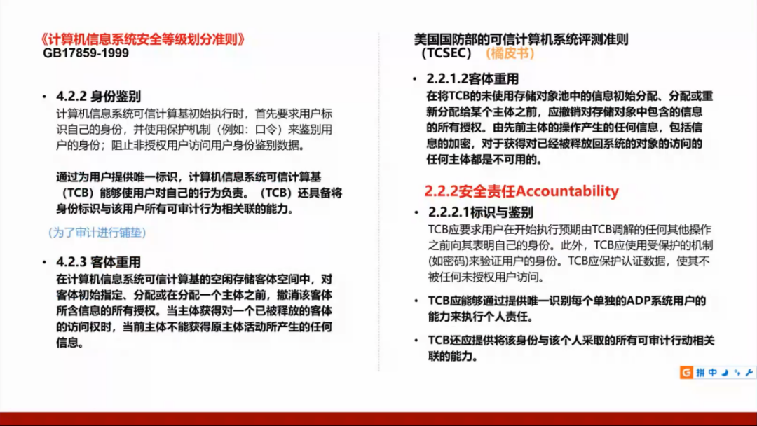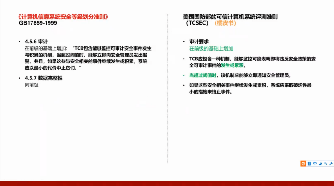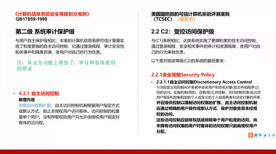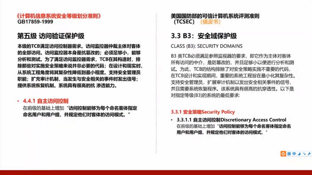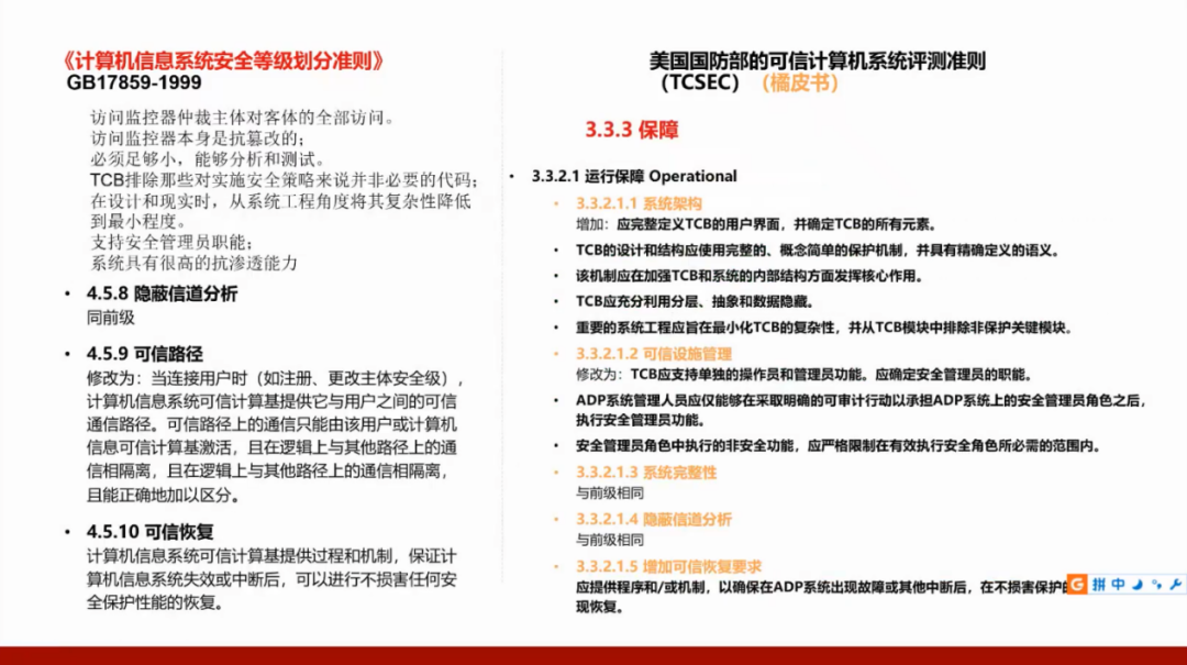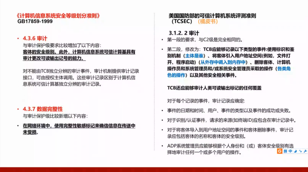 我们国家的GB17859标准是从美国国防部的可信计算机系统评测准则(TCSEC)演变而来,所以需要了解美国的标准,并且将这两个标准进行对照。