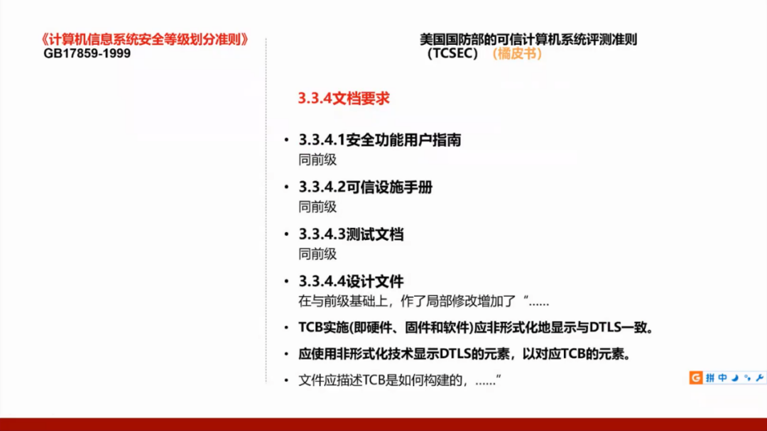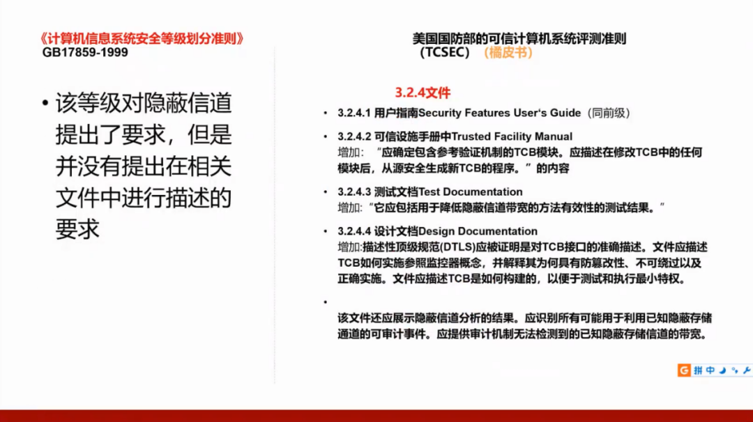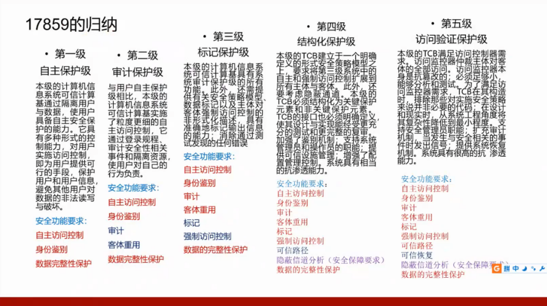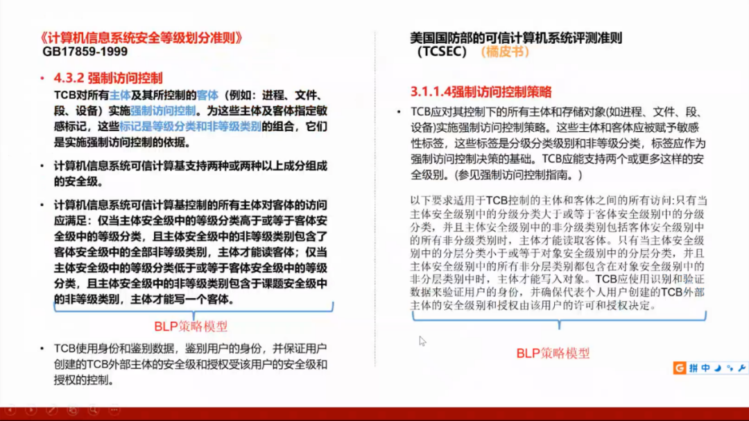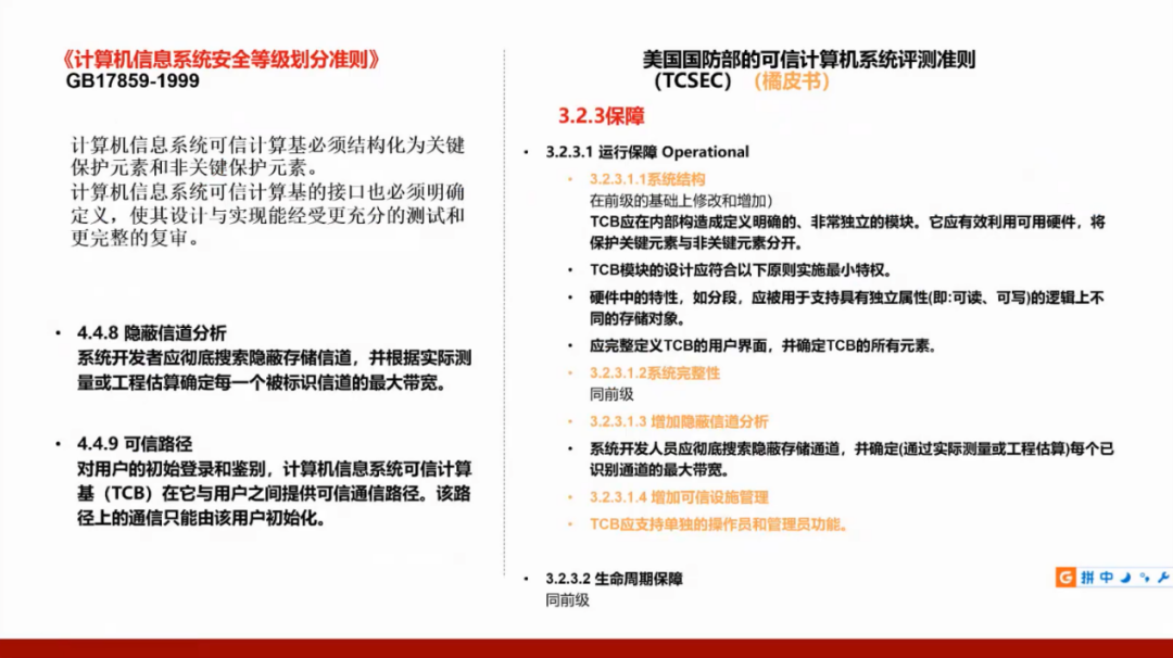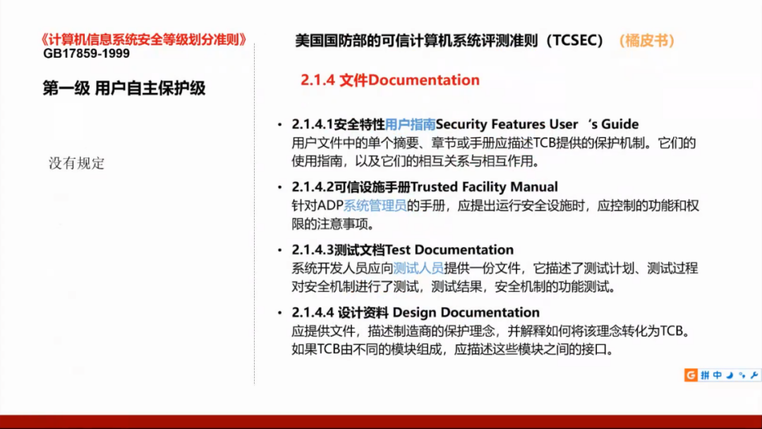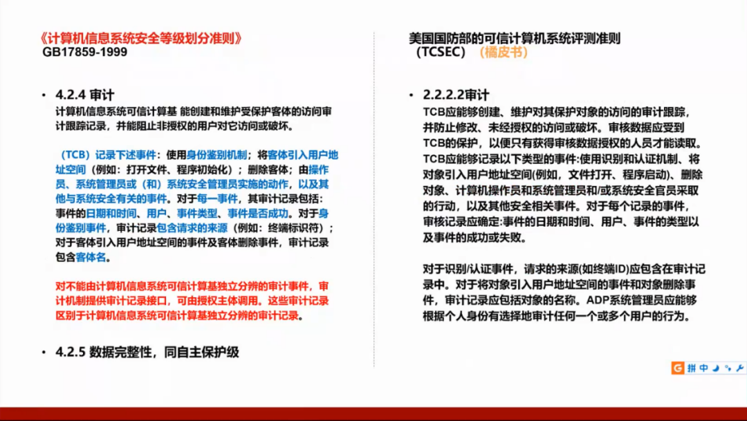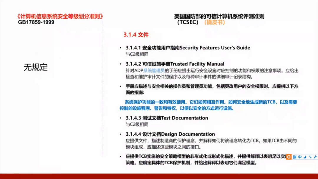 我们国家的GB17859标准是从美国国防部的可信计算机系统评测准则(TCSEC)演变而来,所以需要了解美国的标准,并且将这两个标准进行对照。