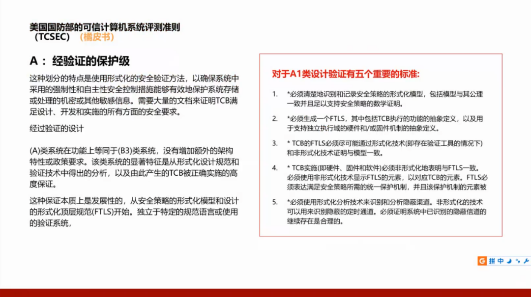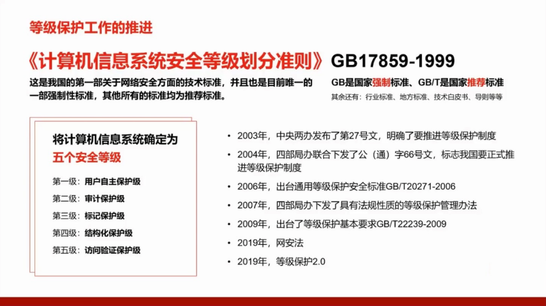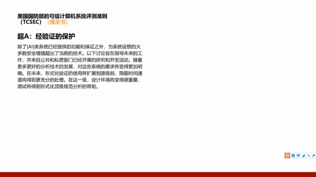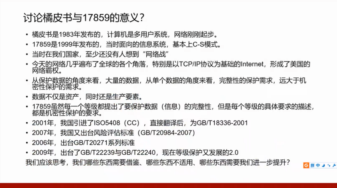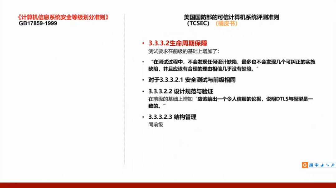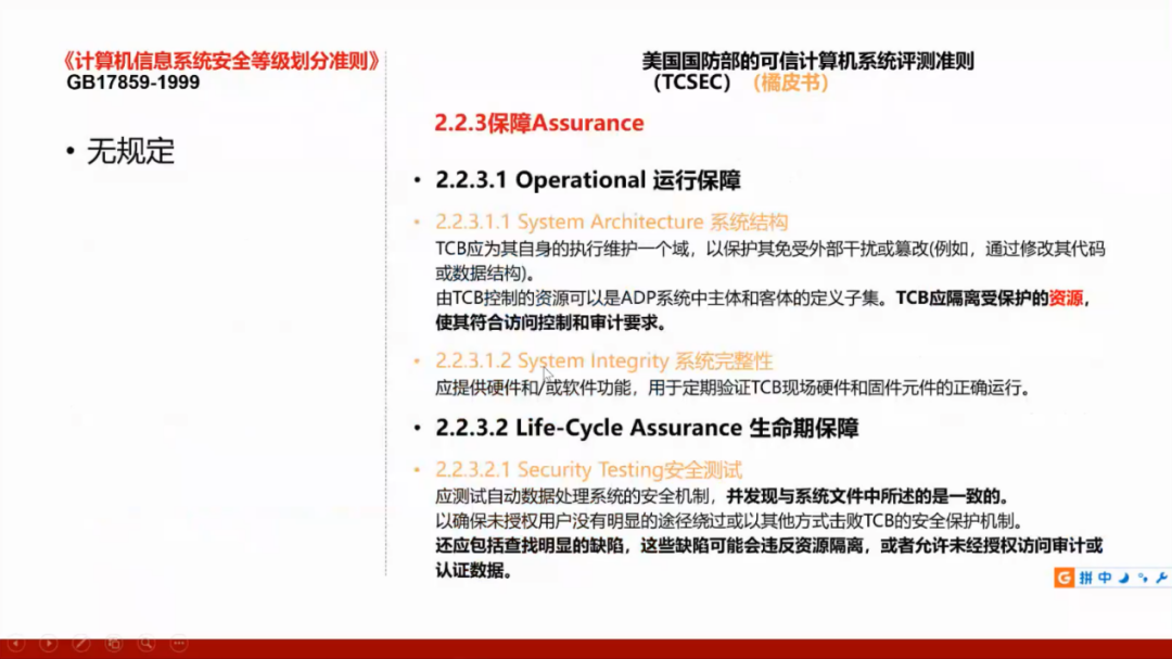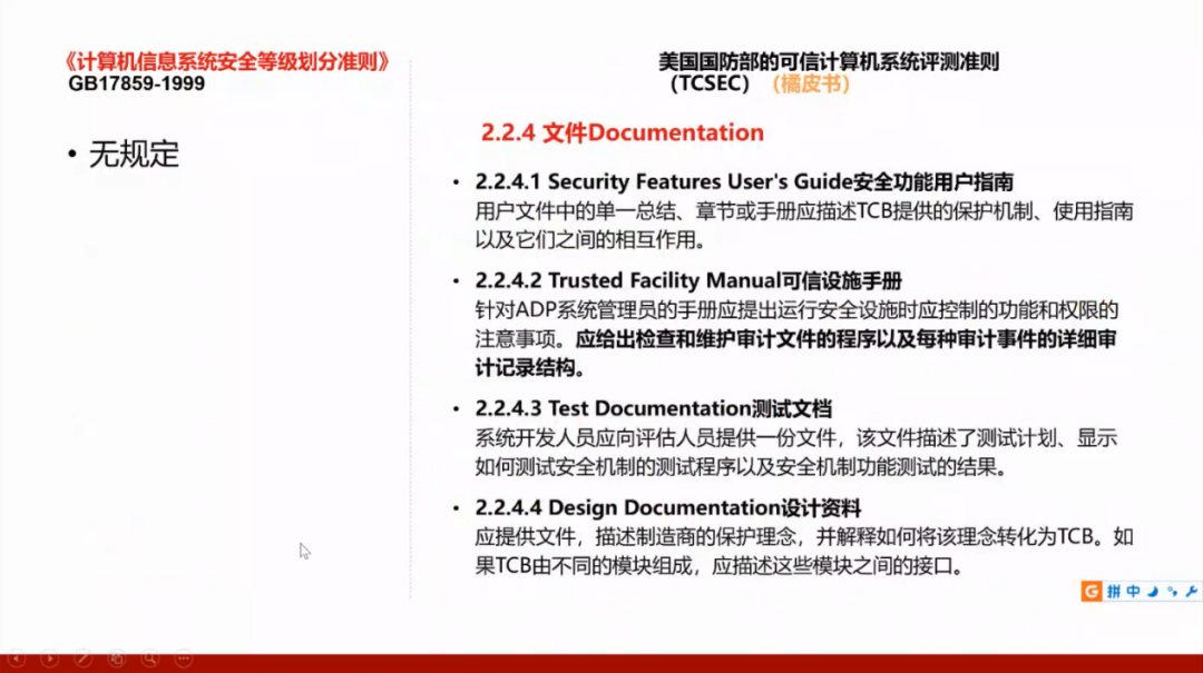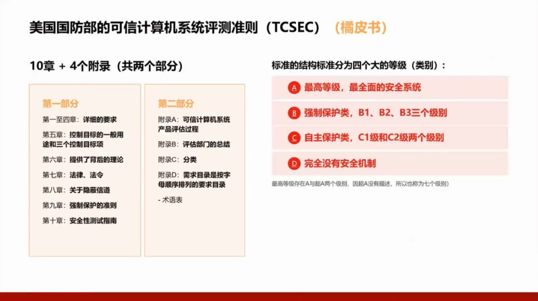 我们国家的GB17859标准是从美国国防部的可信计算机系统评测准则(TCSEC)演变而来,所以需要了解美国的标准,并且将这两个标准进行对照。