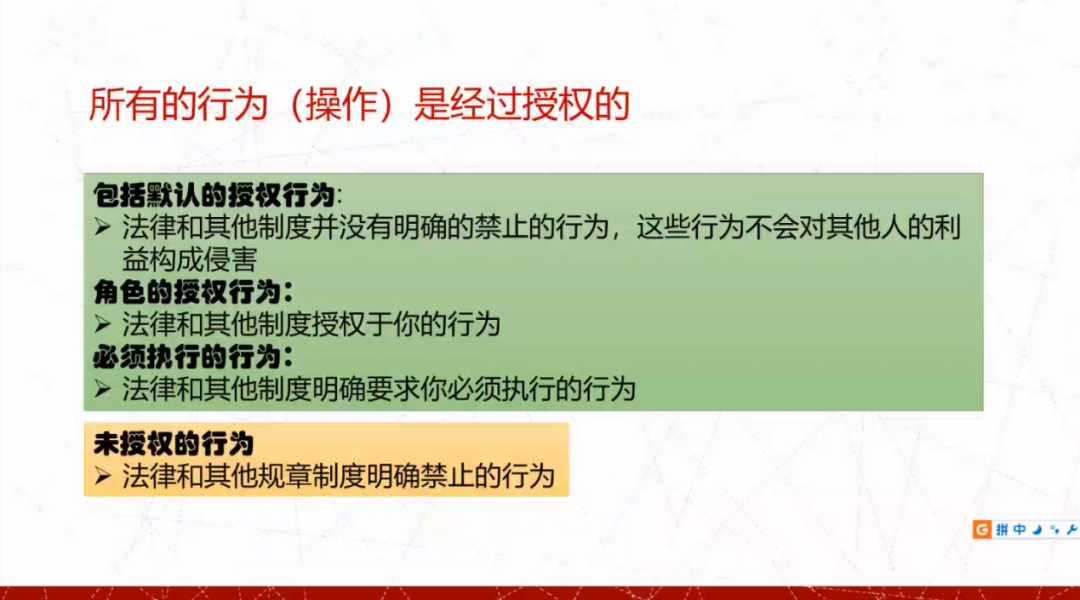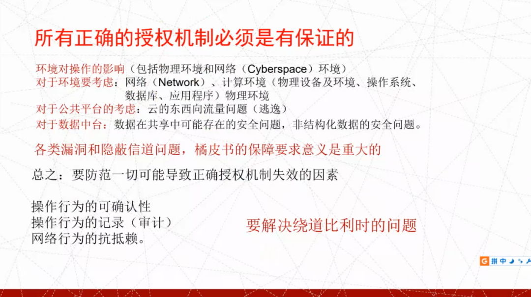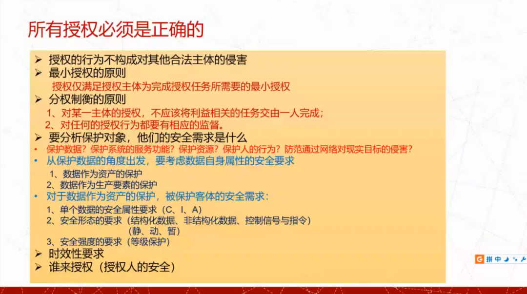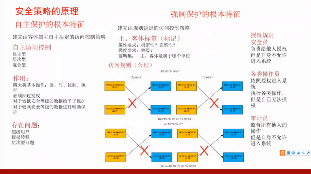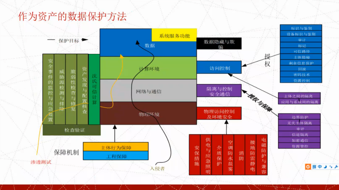 蓝色部分是授权机制,紫色部分是网络和计算机环境的隔离,红色部分是通过物理环境来实施保障,同时也需要从工程角度来实施保障。