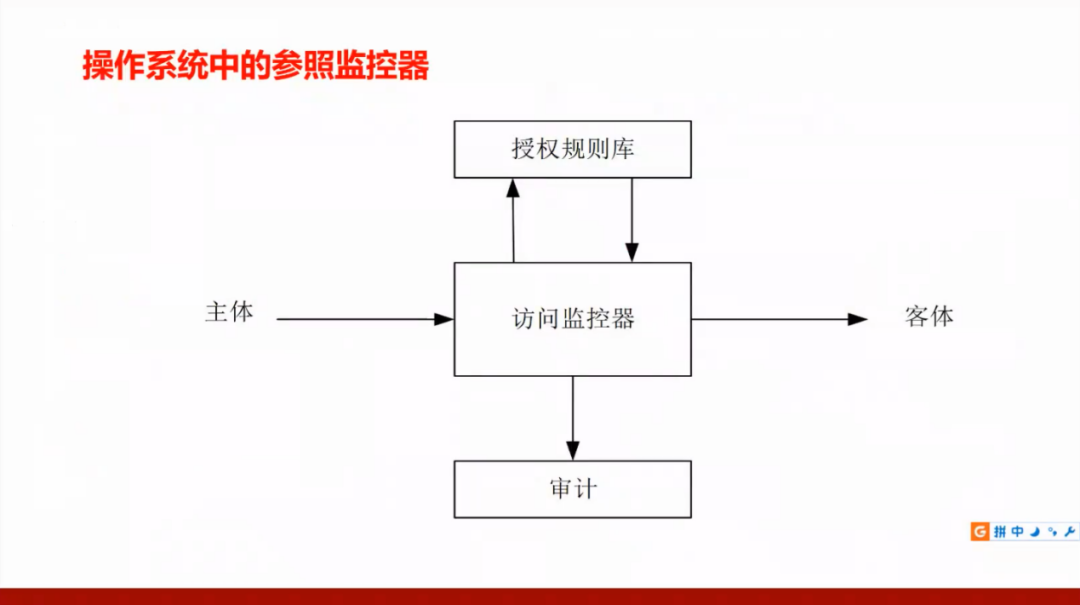 参照监控器,解决主体对客体访问,访问经过规则,规则放在规则库。同时,操作要被审计。