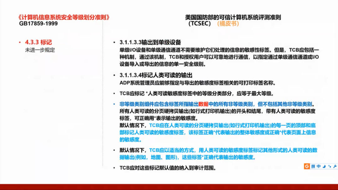 相对于GB17859,橘皮书对标记有进一步要求:标签的完整性要求和输出到多级设备。
