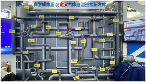 展会工作人员现场向记者展示了声学成像仪,它的正面是一个显示屏,背面是一组64路的麦克风阵列以及光学摄像头,可用于快速扫描目标区域环境,能够收集到1~64kHZ的声音,通过声成像技术可在显示屏上实时看到气体泄漏点位。即便站在40米之外,也能够捕捉管道气体可能泄漏的微妙变化。