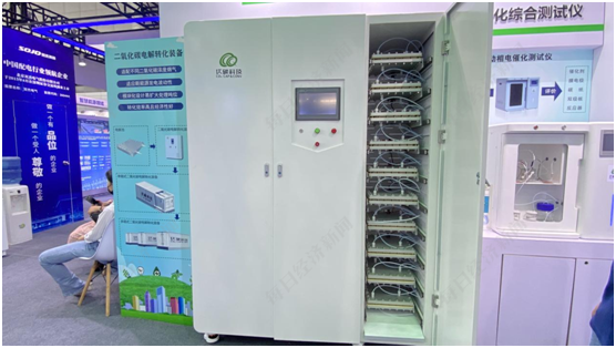 在“三首产品”展区,《每日经济新闻》记者还看到了一款核心技术来自中国科学技术大学的科技成果转化——全球首个电解二氧化碳制甲酸落地项目。