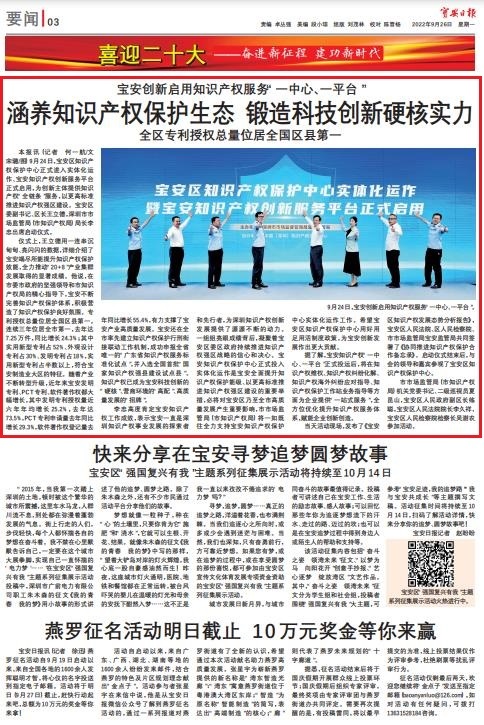9月24日,宝安创新启用知识产权服务“一中心、一平台”。