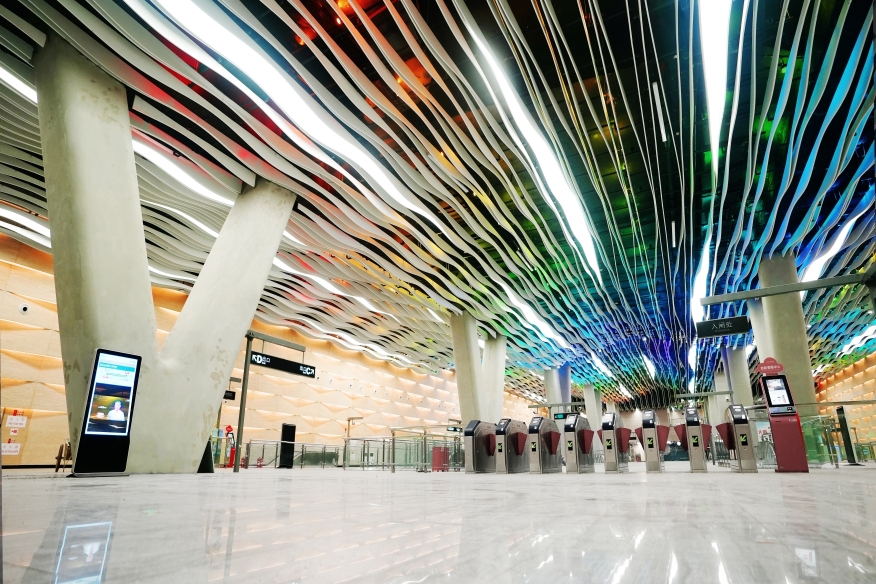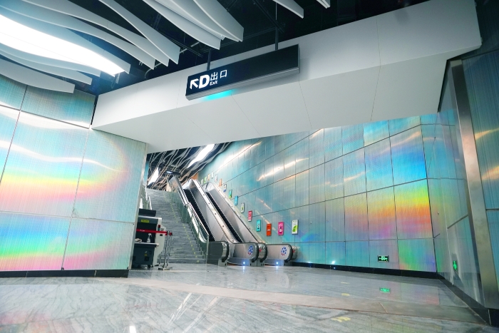 此外,车站地面采用具有水波纹肌理的天然石材,与彩虹主题相呼应,设计融合对天花、墙面、柱子以及地面空间的整体构想,以在地、解构、对话、融会的理念打造车站公共空间,营造出流动、富有韵律的车站空间环境,将其打造成为一张新的城市文化名片。而车站A、C出入口地面分别利用彩色瓷砖、彩虹玻璃形成“彩虹墙”,D出入口通道利用光线折射形成“彩虹墙”,天、地、墙的“彩虹”元素设计,让整个车站极具文化艺术特色,让乘客从进站开始就感受到无处不在的“彩虹”华章。