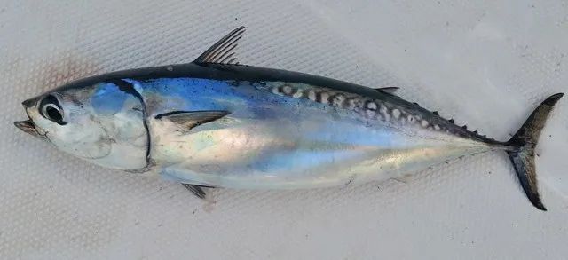裸狐鲣的体型相对粗壮,体表无任何花纹,侧线后半段呈波浪状弯曲,臀鳍起点与第二背鳍终点相对。这些特征使得裸狐鲣成为极具辨识度的鱼类,令人过目难忘。