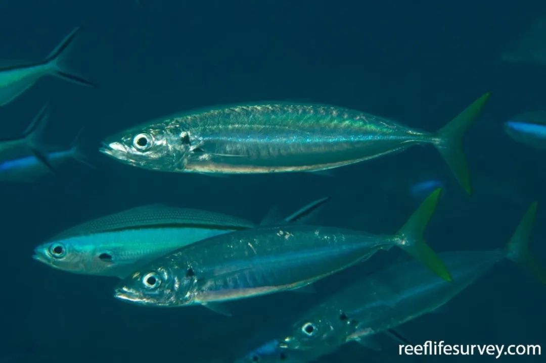 颌圆鲹(Decapterus macarellus),注意其体型相对修长浑圆,棱鳞仅覆盖侧线走直部分的后半部|reeflifesurvey