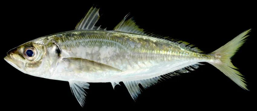 日本竹荚鱼(Trachurus japonicus),其与圆鲹的最大区别在于棱鳞覆盖全部侧线,且尾柄无游离小鳍|黑潮生物研究所