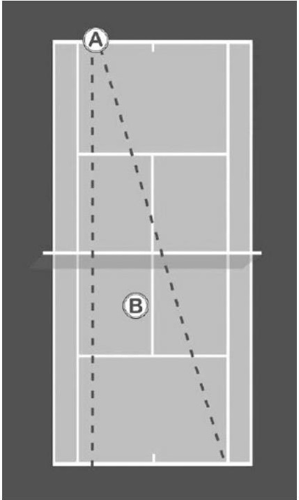 史密斯认为,你向前移动的方向应该是顺着球的飞行轨迹。比如你在正手位打一记极富攻击力的斜线球到对方的正手位,对方回击位置在下图A点附近,他的击球线路选择有两种,要么打直线要么打斜线,你向前跑动的方向应该朝向B点,也就是中线稍偏左侧,大致相当于对方直线球过网点与斜线球过网点中间的位置。