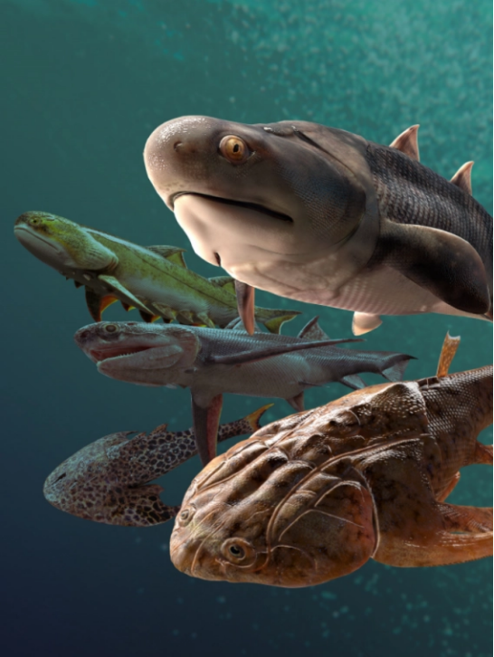 最新发现的5种志留纪古鱼新属种的三维艺术复原,从上到下分别为蠕纹沈氏棘鱼(Shenacanthus vermiformis)、新塑梵净山鱼(Fanjingshania renovata)、双列黔齿鱼(Qianodus duplicis)、灵动土家鱼(Tujiaaspis vividus)和奇迹秀山鱼(Xiushanosteus mirabilis)。这些鱼化石的时代分别为4.36亿年前和4.39亿年前。(拟石科技制作)