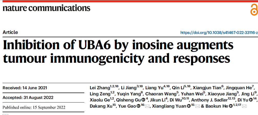 近日,上海交通大学医学院和广州中医药大学深圳市中医院的何宝坤教授团队及合作者于Nature Communications发表了一项最新研究 Inhibition of UBA6 by inosine augments tumour immunogenicity and responses,该研究发现体内肌苷(Inosine)及其衍生物异丙肌苷可通过抑制泛素激活酶UBA6活性增加了肿瘤细胞的免疫原性,进而改善了肿瘤免疫治疗反应。