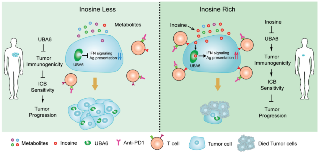 肌苷(Inosine)是人体内源的一种代谢产物,也广泛存在于多种中药之中,例如广地龙、冬虫夏草、半夏等,并且在临床上已经作为治疗慢性肝炎的辅助药,表明肌苷具有较好的临床安全性。以往的研究显示肌酐可通过增强T淋巴细胞功能和代谢促进机体免疫反应。这项研究揭示了肌苷通过抑制肿瘤细胞内UBA6活性,增强肿瘤免疫原性从而促进肿瘤免疫治疗疗效的分子新机制(图),不仅为临床上肿瘤免疫治疗提供一个新药物靶点,也为肌苷、异丙肌苷以及含肌苷中成药与免疫检查点阻断剂的联合用药提供了理论基础。