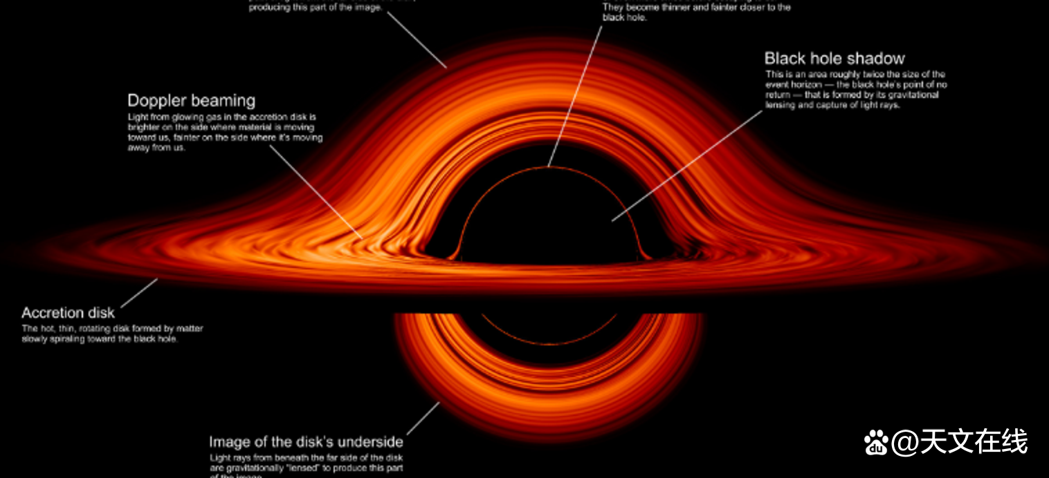 黑洞周围的引力是如此强烈,时空如此扭曲。这产生的结果是在一定距离内,光本身就可以绕黑洞运行。来自背景星系的一些光甚至被困住,永远围绕黑洞循环。