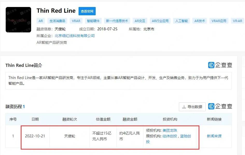 企查查显示,Thin Red Line是一家AR智能产品研发商,专注于AR领域,主要从事AR智能产品设计、开发、生产及销售业务,致力于为用户提供下一代智能产品。