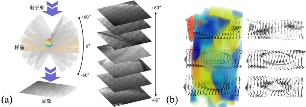 图1 (a)LTEM三维重构的原理。(b)DDI斯格明子的三维磁场分布状态。颜色代表面x-y面内磁矩分量的旋转角度,箭头表示三个剖面上面内磁矩分量的取向。