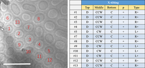 图2 13个DDI斯格明子的极性和手性统计。D:发散的磁矩,C:会聚的磁矩,CCW:逆时针旋转的磁矩,CW:顺时针旋转的磁矩,p:中心磁矩极性朝上,R:右手性,L:左手性。