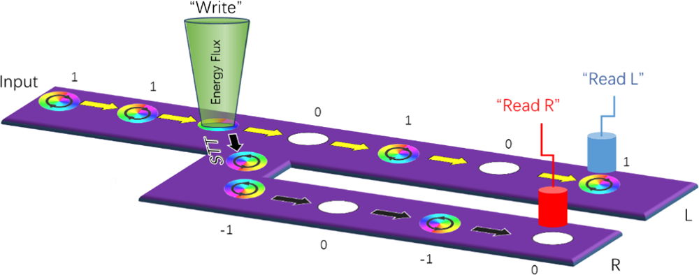图3 在不改变极性的情况下,利用电子束可以直接操控斯格明子手性,从而利用STT效应完成信息的存储。