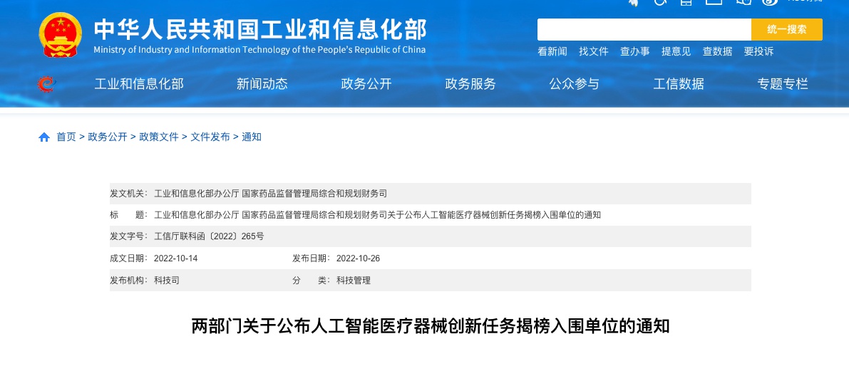 据了解,为加快推动人工智能技术与医疗器械深度融合发展,工信部、国家药监局联合开展人工智能医疗器械创新任务揭榜工作,征集并遴选一批具备较强创新能力的单位集中攻关,推动人工智能医疗器械创新发展,加速新技术、新产品落地应用。