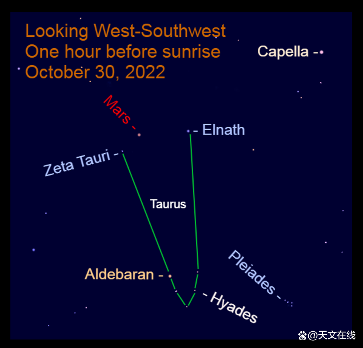 图描述- 2022年10月30日:黎明前,火星在金牛座角的上方