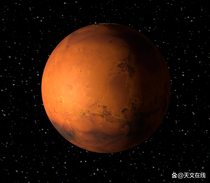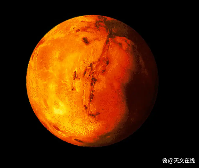望远镜中的火星是个红褐色的球体。如果天空清晰度高,那么便可看见火星更多的特征。