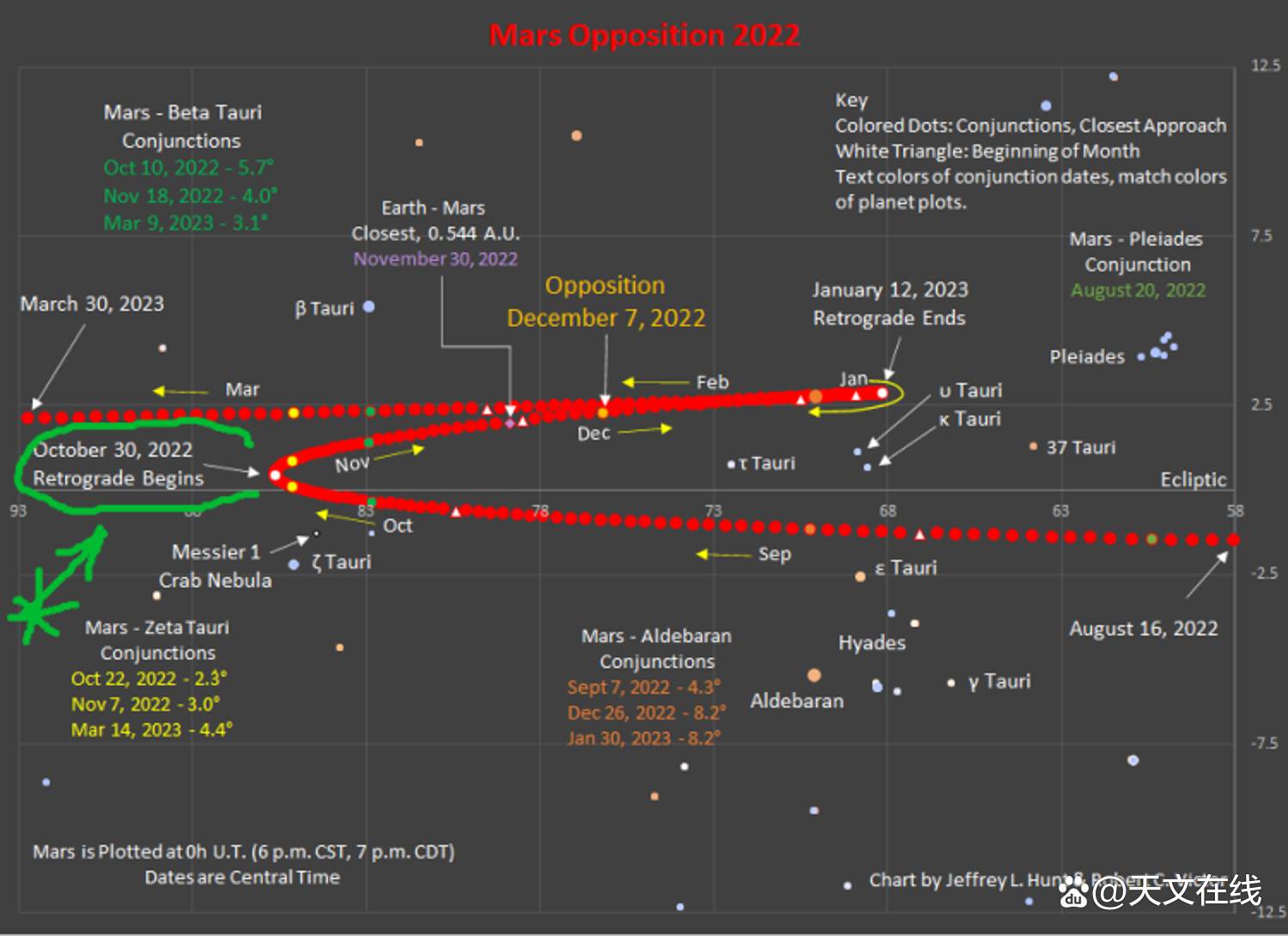 11月30日,地球将经过金牛座的两“角”之间,这时地球离火星最近。火星的轨道并非一个正圆。11月30日后,火星将离我们越来越远。
