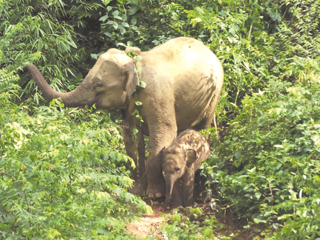 在马来半岛,一头戴GPS项圈的母象和它的幼崽。受访者供图