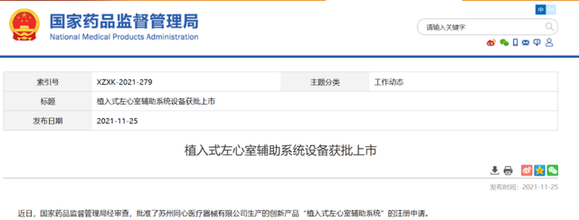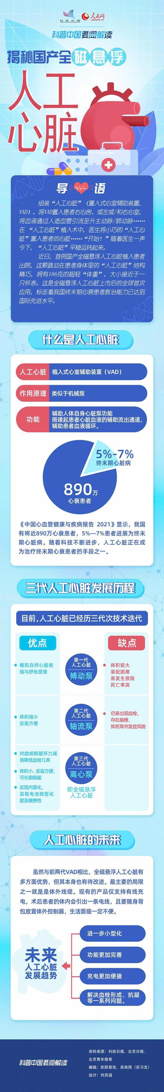 2021年11月25日,自主研发的植入式左心室辅助系统CH-VAD获得国家药品监督管理局(NMPA)批准上市。这是我国首个获得NMPA批准的拥有完备自主知识产权的国产人工心脏,也是全球范围内首个获得NMPA批准的全磁悬浮式人工心脏,标志着全球新一代(全磁悬浮技术路线)心室辅助装置产品在中国商业化落地,将开启中国心衰治疗新时代。