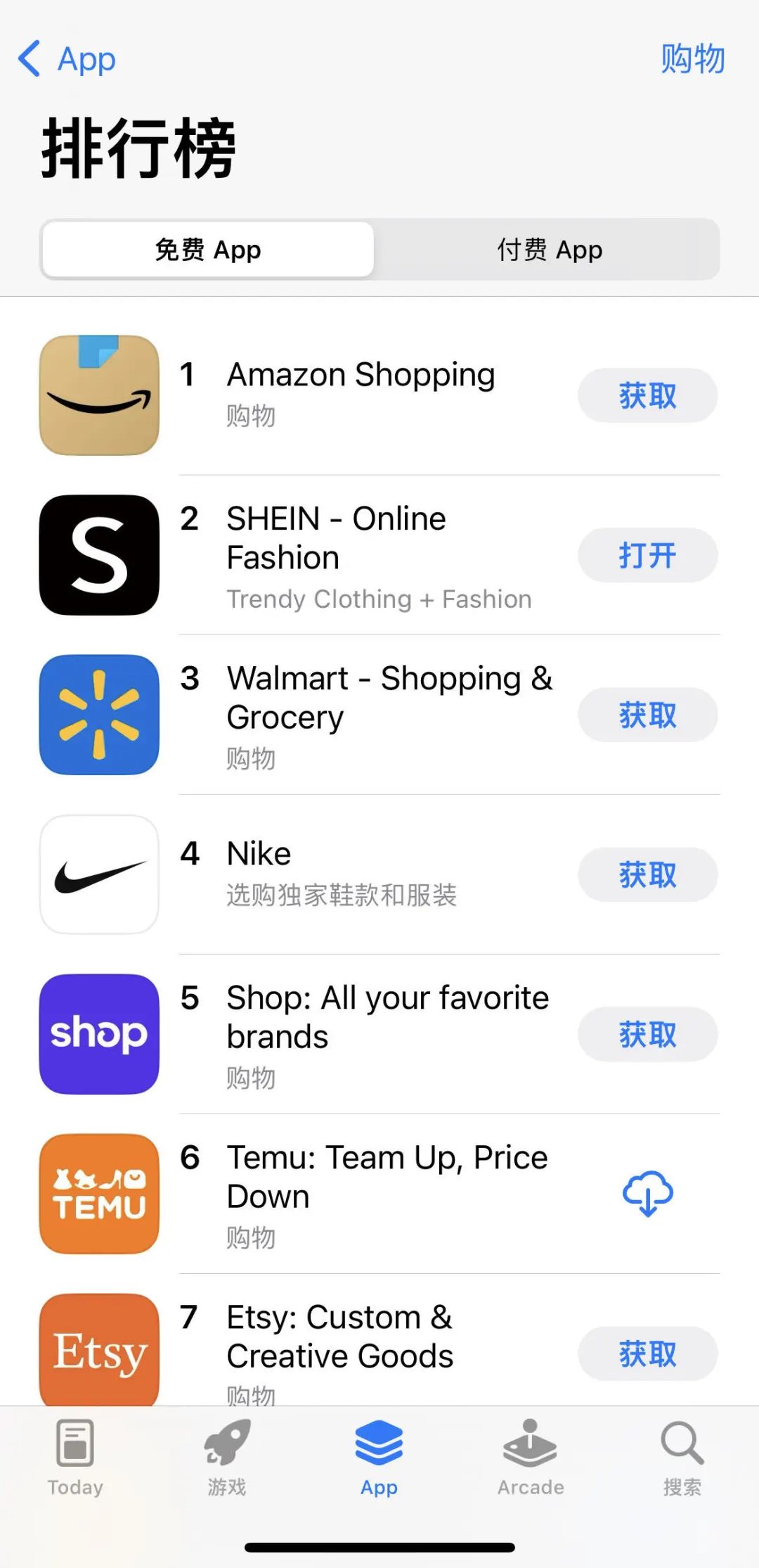截至10月26日,Temu在美国苹果商店购物类APP中排名已冲至第5位,前四名分别是Amazon Shopping、SHEIN、Walmart以及Shop。