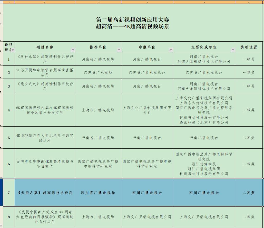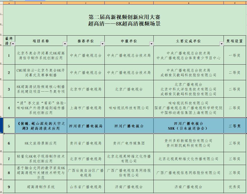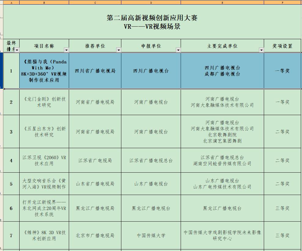 国家广播电视总局第二届高新视频创新应用大赛决赛结果揭晓。四川广播电视台摄制的8K+3D+沉浸式空间声VR360°纪录片《Panda With Me》、4K纪录片《天府之翼》、8K风光片《俯瞰——岷山深处的天空之湖》作为我省内容领域进入决赛的代表作品,分别荣获一、二、三等奖。