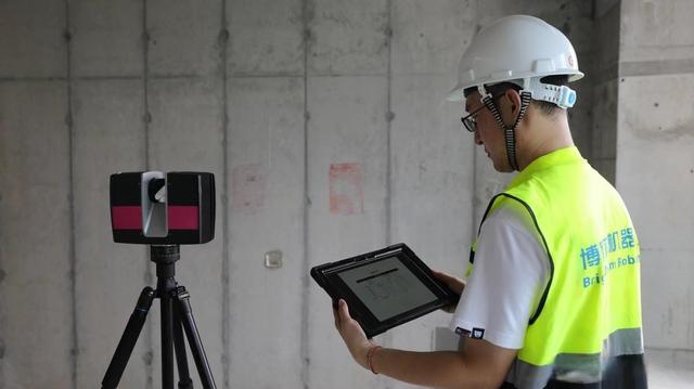 这是测量机器人正在作业。“它可以用于建筑前期的测量放线、精装修的平整度、垂直度检查、排版辅助等,精度误差更小,操作人员更少,内业计算更简便。”陈健介绍,较于传统人工,机器人施工在安全、质量、效率等方面都有显著的优势。