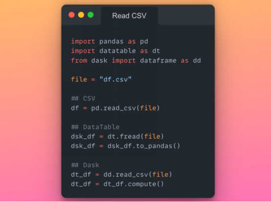 如果我们通过 Dask 和 DataTable 读取 CSV,它们将分别生成 Dask DataFrame 和 DataTable DataFrame,而不是 Pandas DataFrame。假设我们想坚持传统的 Pandas 语法和函数(由于熟悉),我们必须首先将它们转换为 Pandas DataFrame,如下所示。