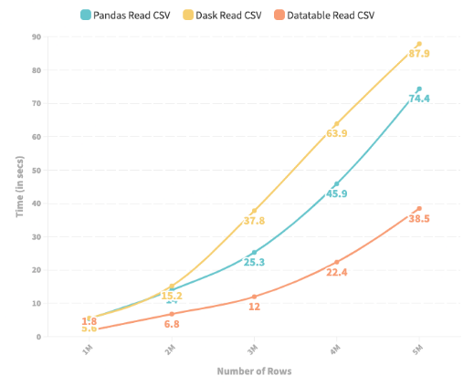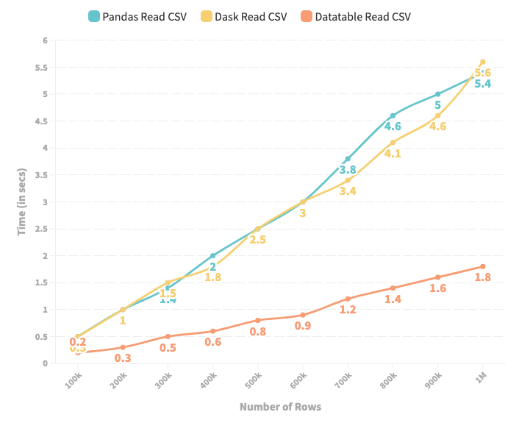 下图描述了 Pandas、Dask 和 DataTable 读取 CSV 文件并生成 Pandas DataFrame 所花费的时间(以秒为单位)。CSV 的行数从 100k 到 500 万不等。