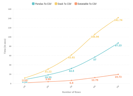 下图描述了 Pandas、Dask 和 DataTable 从给定的 Pandas DataFrame 生成 CSV 文件所花费的时间(以秒为单位)。行数范围从 100k 到 500 万。