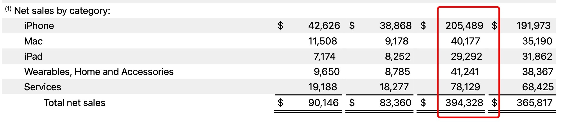 Canalys研究分析师表示:"在iPhone 13和新推出的iPhone 14系列的推动下,苹果在第三季度的市场份额达到了前所未有的高度。尤其是备受欢迎的iPhone 14 Pro和Pro Max,将为苹果带来更高的平均售价和稳定的收入。”结合财报来看,iPhone营收稳健,截至2022年9月24止三个月,iPhone营收426.26亿美元,同比增长10%;截至2022年9月24止12个月(2022财年),iPhone总营收2054.89亿美元(约1.5万亿人民币),同比增长7%。
