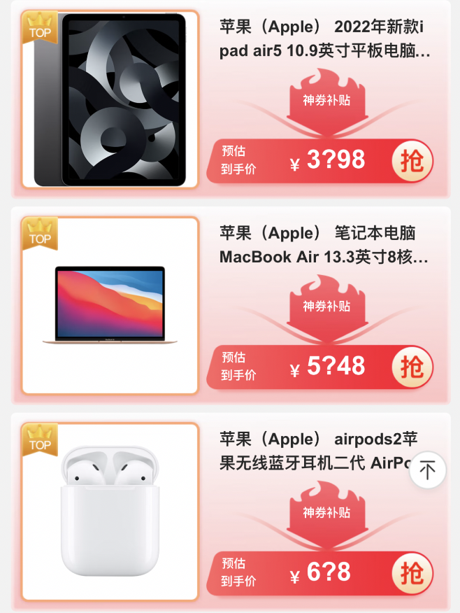 这一价格引发了不少网友的围观。很多网友猜测,在京东专项补贴下,榜单上的5款产品会不会打破此前全网购入的最低价,毕竟价格“1”字打头的iPad 9代还是第一次见,而AirPods Pro 2、iPad Air5 10.9英寸、MacBook Air 13.3英寸M1 8G+256G版、AirPods 2代等产品的价格也非常值得期待。