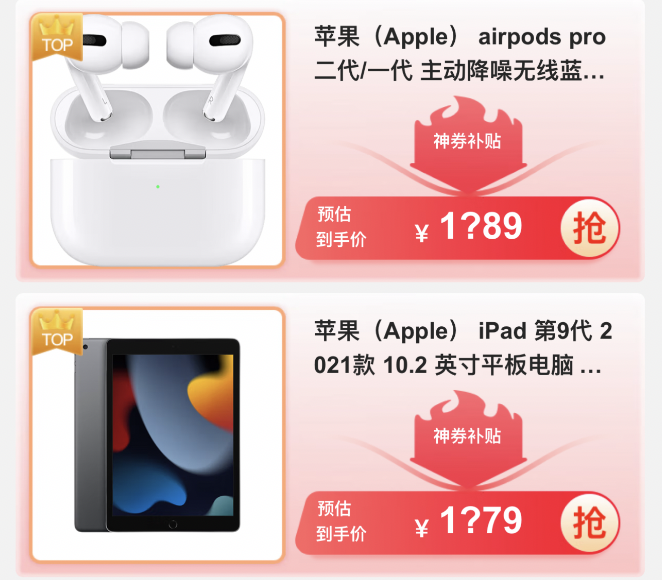 近日,据京东电脑数码站内上线的“Apple专享补贴 11.11必买榜”活动页面显示,AirPods Pro 2、iPad 9代等5款Apple产品将在10月31日晚8点迎来惊喜价格。虽然价格未完全公布,但根据专享补贴后,产品预估到手价百位数上“?”两边的数字来看,很有可能这些Apple产品的价格在11.11期间比拼多多还要低。其中,iPad 9代“1?79”的价格欲遮还羞,直接表明其售价不会超过2000元。