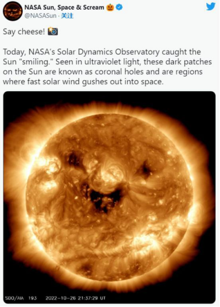 据NASA拍摄的图像显示,太阳大气中出现三处清晰的黑点,就像一对圆圆的眼睛和一个上扬的嘴角。这些斑点其实是位于日冕层的日冕洞,也就是太阳最外层大气的一些区域,太阳风经由这些区域进入太空。