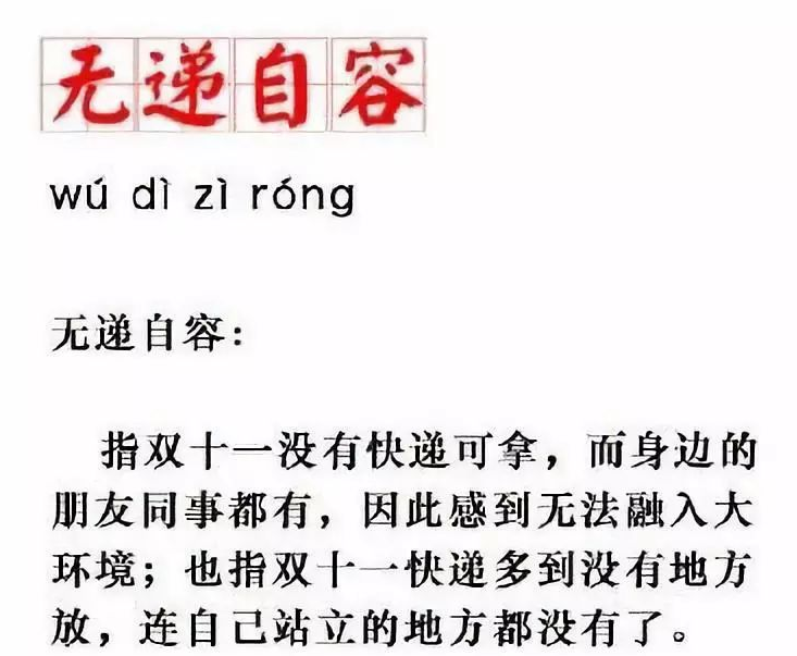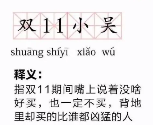 #双十一文学#双十一早已不是购物节这么简单,人们自发的去创作出关于双11的文字梗将中华文化的博大精深展现的淋漓尽致。比如“双11小吴”专指嘴上说着不买,背地里却买的比谁都欢的一类人;朋友之间为互抄购物车作业形成21世纪才有的“链接友谊”,而他们的存在导致快递站的快递箱多到“无递自容”,根本无处落脚......你还知道哪些#双十一文学#?