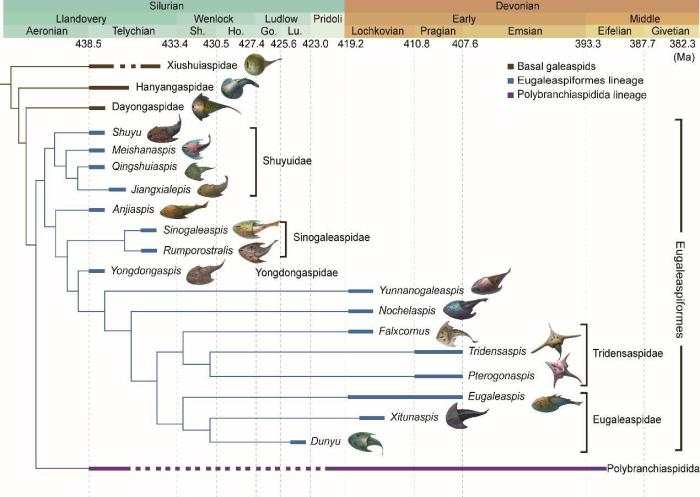 盔甲鱼类的系统发育关系及地史分布。 中科院古脊椎所 供图