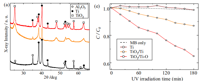 图2 (a) 利用机械涂覆法制备的TiO₂/Ti复合光催化涂层的XRD图样及(b) 该涂层对有机染料MB的光催化降解