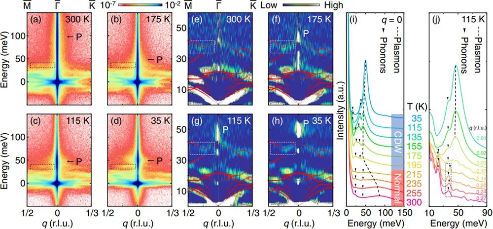 图一 使用高分辨电子能量损失谱测量得到的1T-TiSe2中的等离激元与声子的变温行为。(a)-(d)原始测量数据,虚线方框标注了声子,符号P标注了等离激元。(e)-(h)是(a)-(d)的二次微分(彩色映射图)叠加上理论计算的声子谱(红色三角形)。(i)q = 0处变温的能量分布曲线堆积图。(j)115 K温度下,不同动量的能量分布曲线图。