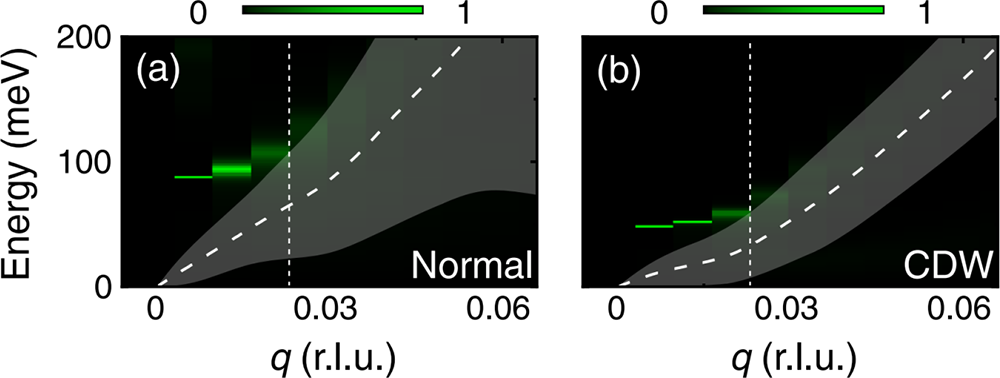 图二 理论计算得到的1T-TiSe2正常相与CDW相的损失函数,粗虚线与灰色阴影代表单粒子激发引起的朗道衰减区域,细虚线标注了等离激元开始衰减的动量。